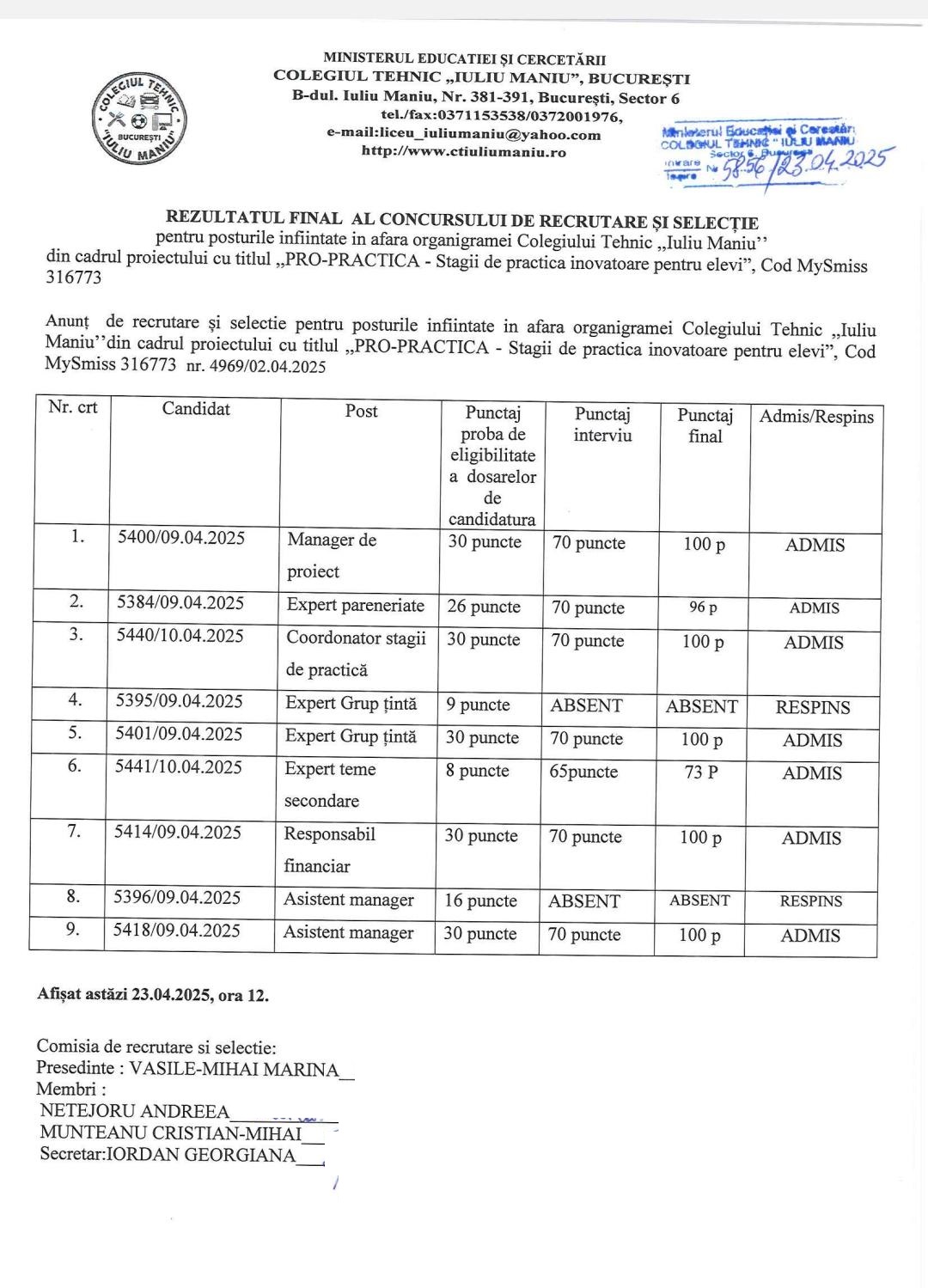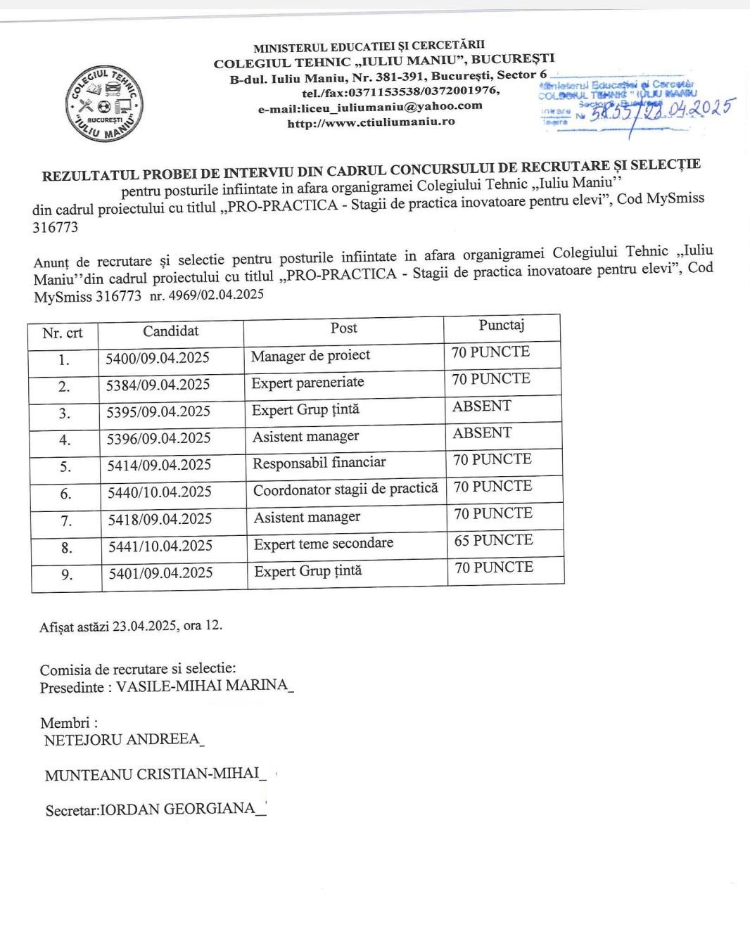 Rezultate proba interviu din cadrul concursului pentru ocuparea posturilor înfiintate in afara organigramei Colegiului Tehnic ,,Iuliu Maniu’’ din cadrul proiectului cu titlul ,,PRO-PRACTICA - Stagii de practica inovatoare pentru elevi”, Cod MySmiss 316773_publicat 23.04.2025.